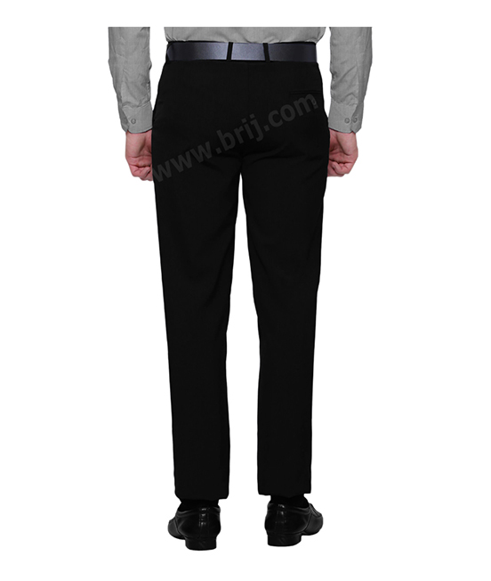 BCNA-070Black formal mid-rise flat-front trousers, has three pockets, a zip fly and button closure, waistband with belt loops.