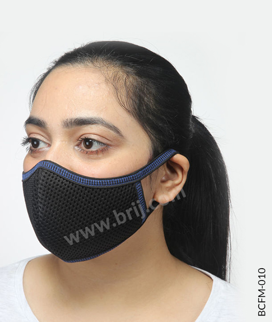 BCFM-0102 layer concave shape reusable face mask in 100% Poly Mesh fabric outside and 100% cotton S/Jersey fabric inside, with soft fabric earloops & contrast zig-zag stitches as per brand colours.