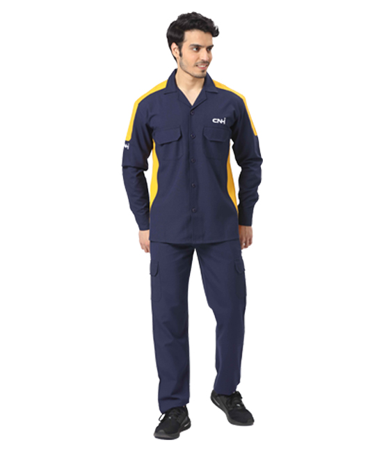 BCWW-012Navy full sleeves colourblocked werkwear top made in Poly Viscose fabric, styled with cut & sew pattern as per brand colours, double pockets at front with flap. Embroidery at front and sleeve, High-Vis reflective logo at back. Paired with semi elasticated trousers with with multi utility pocket.