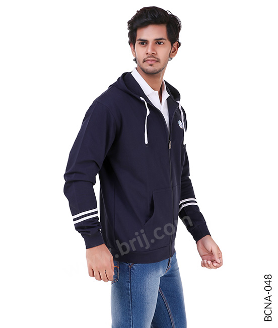 BCNA-048Navy front open sweatshirt made in winter fleece fabric. Styled with contrast stripes at sleeves, with digital transfer logos at front & back for increaded brand visibility.