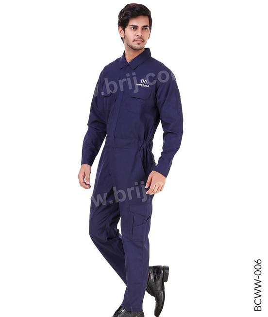 BCWW-006Navy full sleeves colourblocked werkwear coverall made in Poly Viscose fabric, has two front flap pockets with front zipper with a flap, semi ealsticated waistband for the perfect with 6 multi utility pockets, reflective logo at front for high brand visibility & safety.