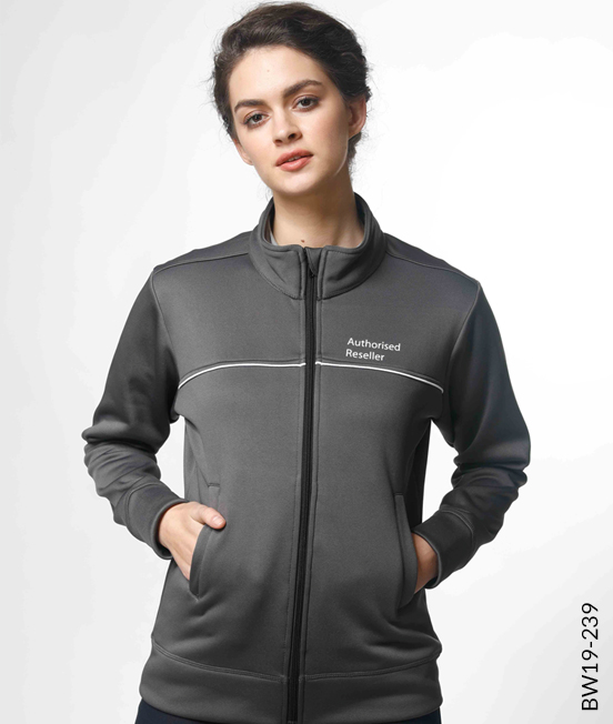 BW19-239Premium front open sweatshirt made in 100% Premium Polyester winter fleece fabric. Styled in stand collar with contrast piping at front yoke, with digital print logos for increaded brand visibility.